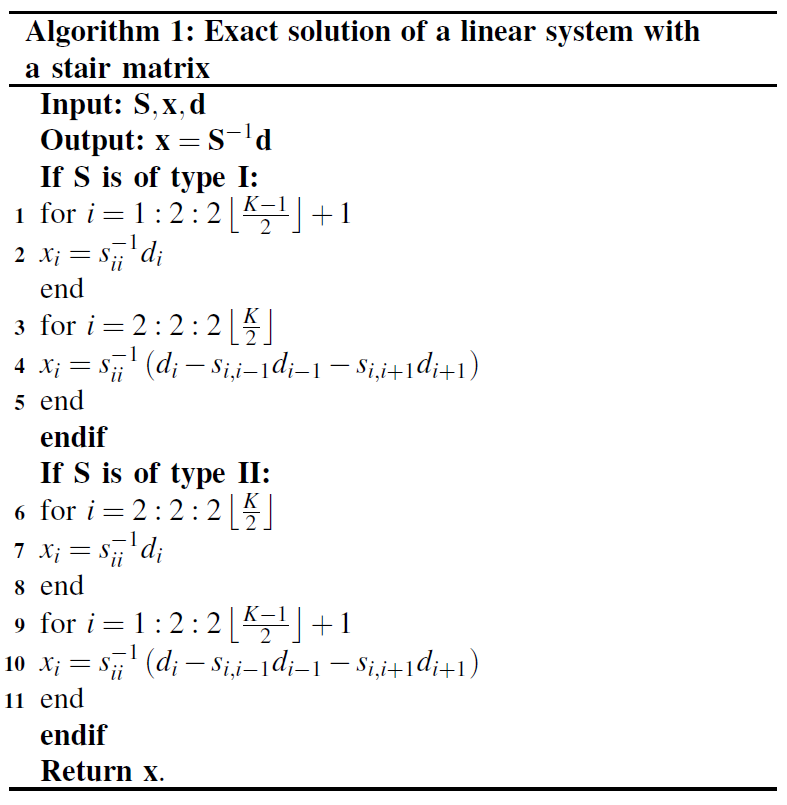 It is also noted that if [TeX:] $$\mathbf{S}$$ is a stair matrix, then [TeX:] $$\mathbf{S}^H \text { and } \mathbf{S}^{-1}$$ are also stair matrices [28]. If we have a linear system [TeX:] $$\mathbf{S x}=\mathbf{d} \text {, }$$ the solution can be immediately obtained by computing [TeX:] $$\mathbf{S}^{-1} \mathbf{d}$$ [38]. Algorithm (1) solves the stair linear system where [TeX:] $$d_i=0$$ if [TeX:] $$i\lt 1 \text { or } i\gt K.$$