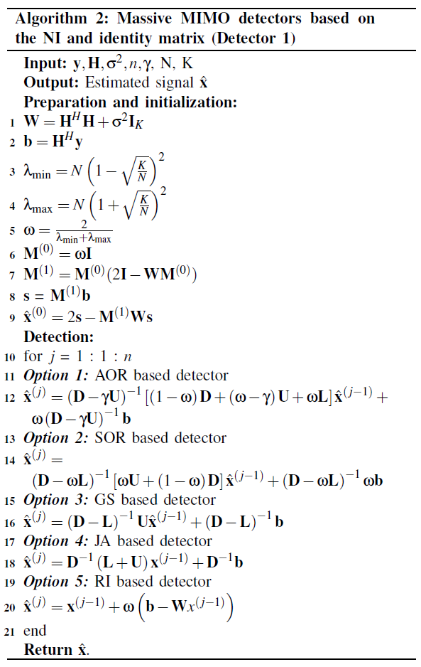 Algorithm (2) presents the proposed initialization of massive MIMO detectors with the corresponding iterative methods.
