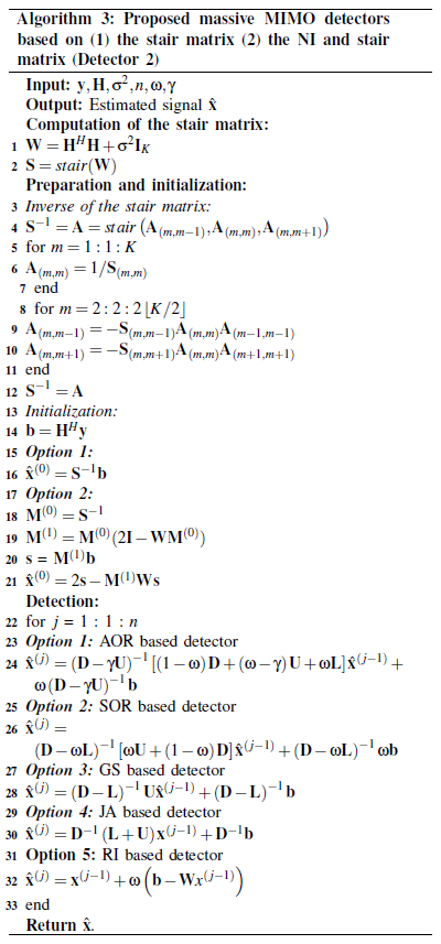 Algorithm (3) describes the proposed massive MIMO detectors based on the stair matrix and the NI formula.