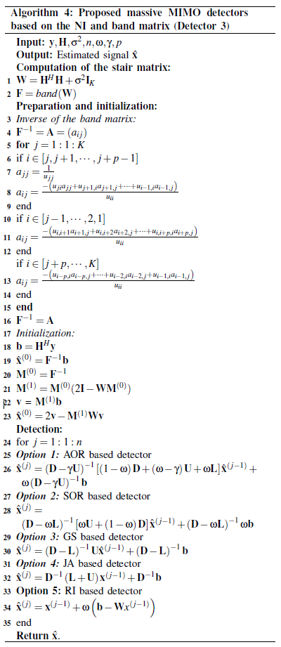 Algorithm (4) shows the details of initialization and the proposed massive MIMO detectors based on the band matrix and the NI method.
