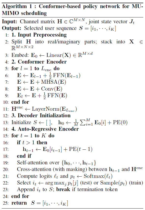 Based on the above procedure, we acquire a Conformerbased policy network, as summarized in Algorithm 1, where [TeX:] $$\mathbf{E} \in \mathbb{R}^{M \times d}$$ denotes the intermediate embedding matrix produced during each layer of the Conformer encoder and the d denotes the embedding dimension. Given the complex-valued channel matrix [TeX:] $$\mathbf{H}$$ and the state vector [TeX:] $$\boldsymbol{J}_t,$$ the network outputs a user scheduling sequence [TeX:] $$\boldsymbol{S}=\left[i_1, \cdots, i_K\right] .$$ The process begins by splitting the channel matrix into its real and imaginary components and projecting them into a high-dimensional embedding space. These embeddings are then refined through multiple Conformer encoder layers, each consisting of FFN, MHSA, and convolutional blocks. After encoder processing, the decoding phase is initialized using the average of the initial embeddings and position encoding. In the autoregressive decoding stage, users are sequentially selected using selfattention over the previously selected users and cross-attention with the encoded channel features, while applying masking to prevent duplicate selections. The decoding continues until the desired number of users is selected or a termination condition is met.